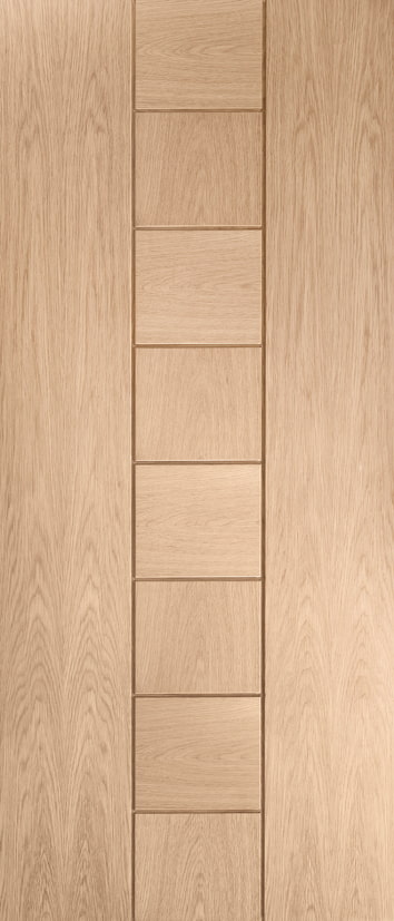Doors have an Oak veneer and are factory prefinished with clear lacquer. Each door features horizontal and vertical grooves into oak inlay. These doors have an engineered chipboard core to ensure a weighty feel.